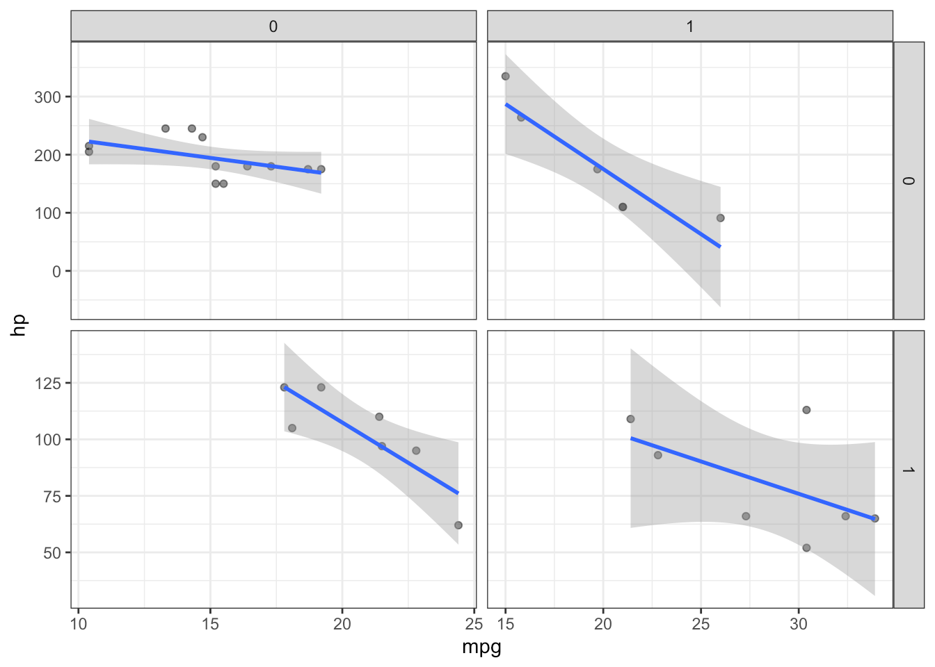 Here we are plotting the relationship between horsepower (hp) and miles per gallon (mpg) in a dataset of cars. I’ve used facet_grid()